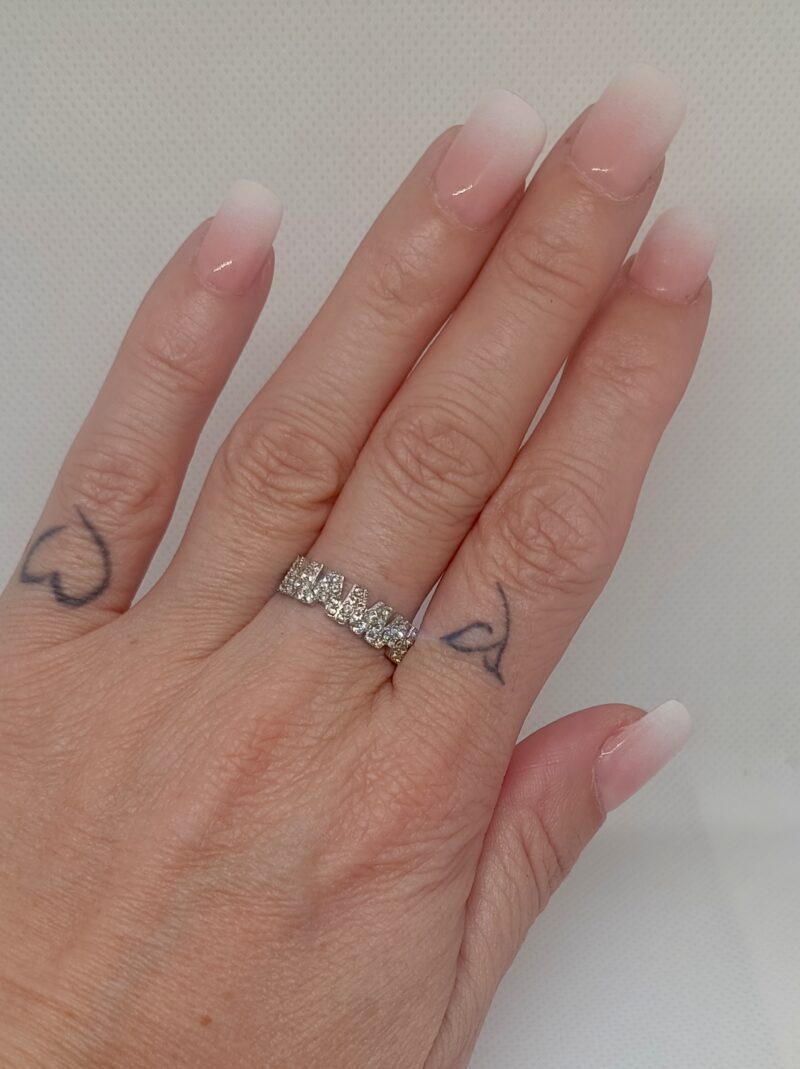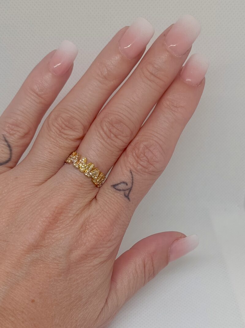 Brilla como una reina con nuestro Anillo Mama, un diseño elegante lleno de circonitas para un efecto luminoso y sofisticado. Su diseño abierto lo hace ajustable, perfecto para adaptarse cómodamente a cualquier dedo.