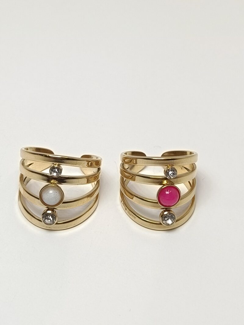 En el centro, una piedra redonda aporta personalidad a la pieza, acompañada de circonitas blancas que añaden un toque de brillo sutil y refinado.