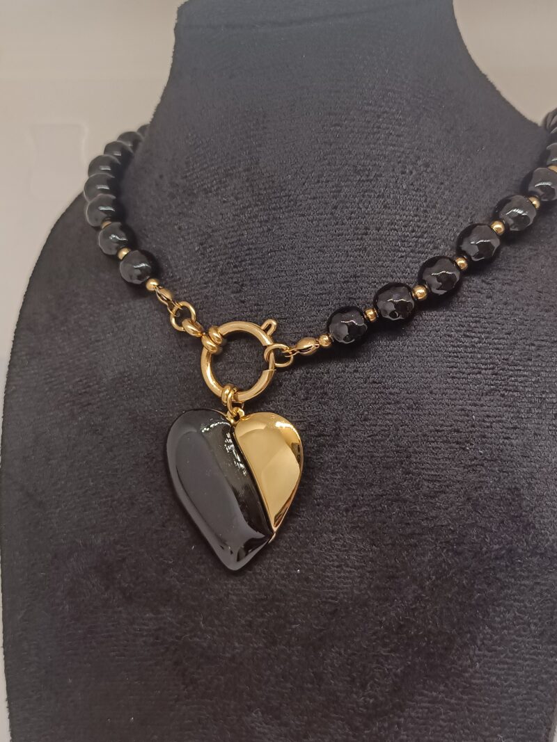 El Collar Amor combina elegancia y carácter en una pieza única. Su colgante de corazón dividido en negro y dorado crea un contraste moderno y sofisticado que simboliza equilibrio, unión y dualidad.