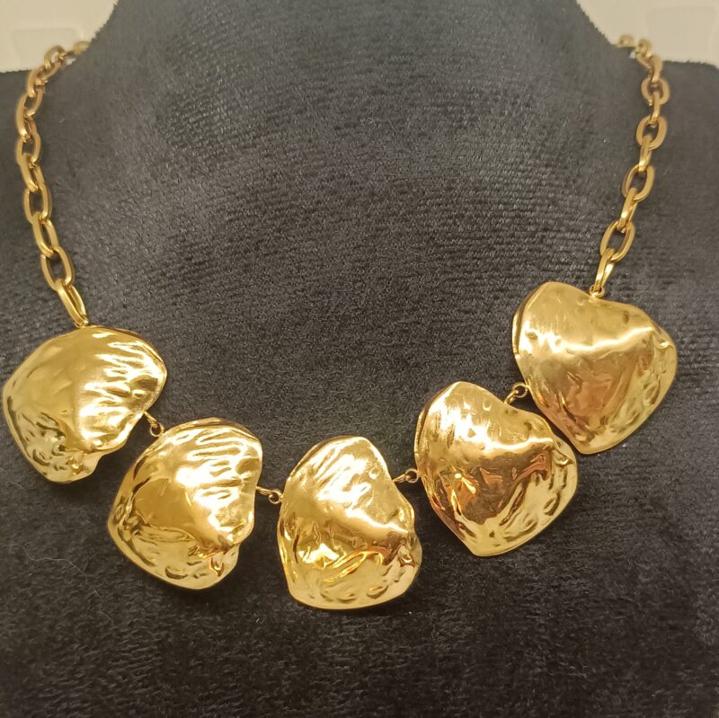 El Collar Rocas Doradas es una pieza atrevida y sofisticada diseñada para destacar. Sus cinco piezas con forma orgánica, de acabado martillado y efecto escultura, crean un look moderno, elegante y lleno de personalidad.
