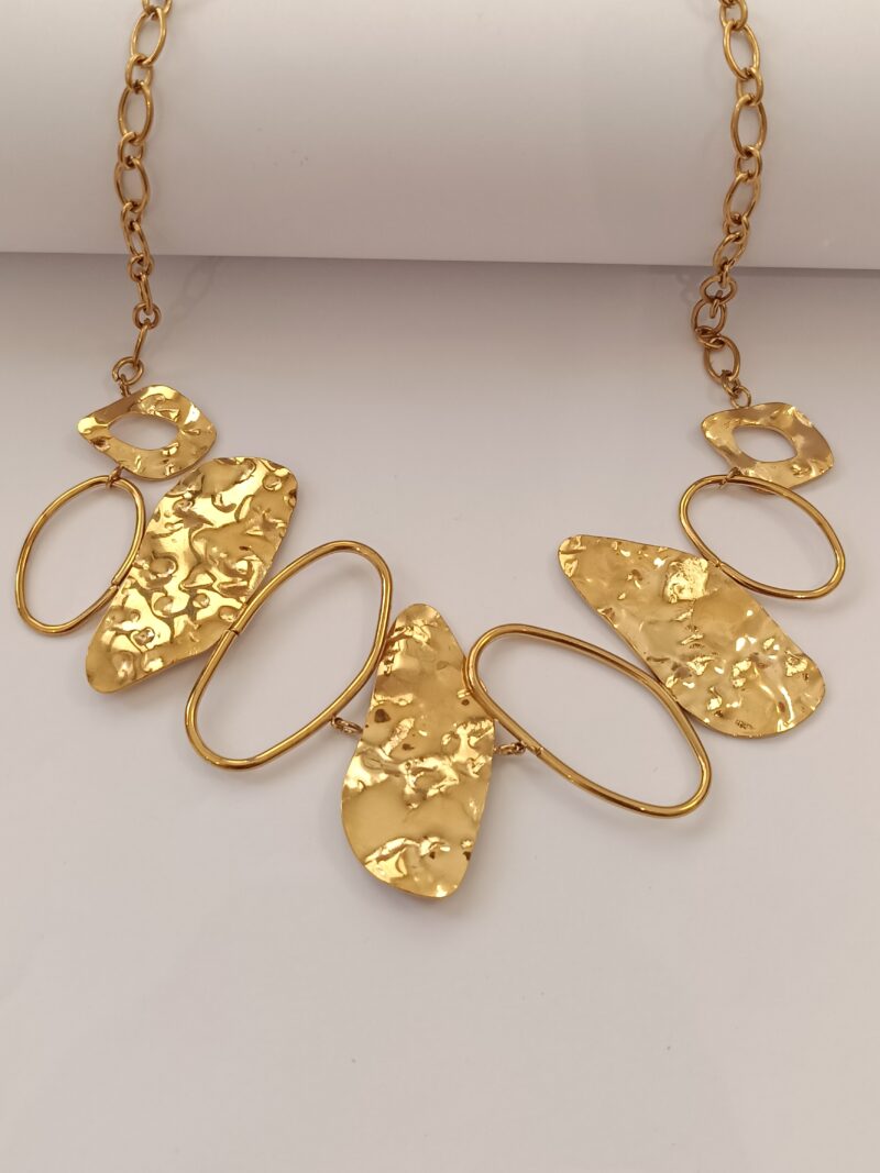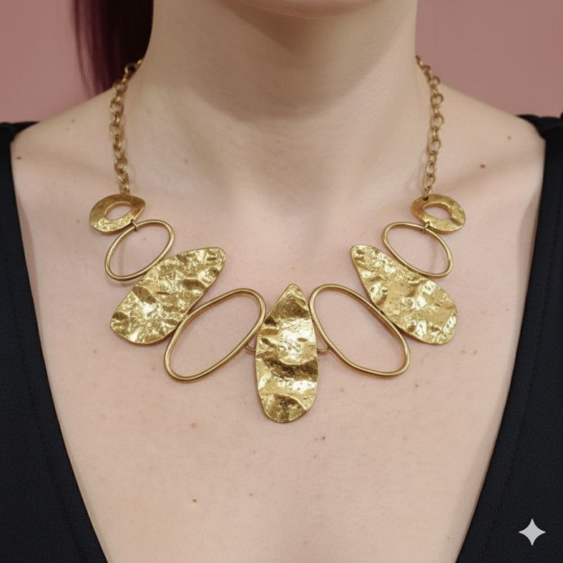 El Collar Solaris luce espectacular puesto, aportando un toque elegante y moderno al look. Sus piezas ovaladas en acabado liso y martillado resaltan sobre la piel y se adaptan muy bien al escote, creando un efecto llamativo sin perder la sofisticación.