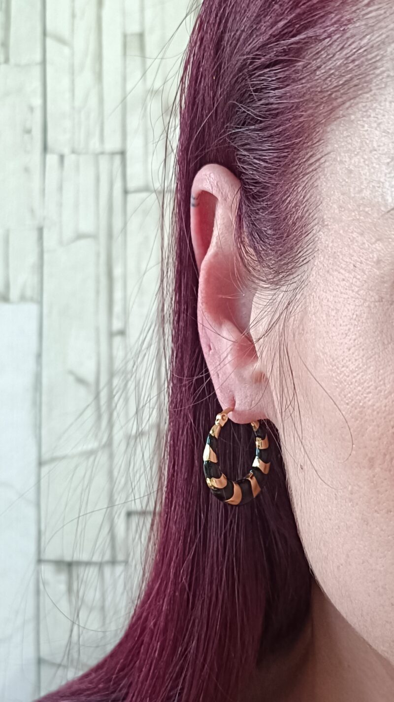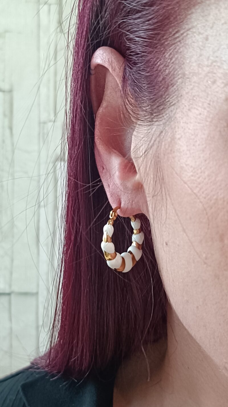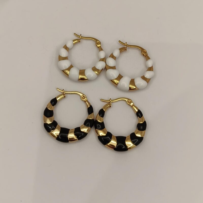 Los Pendientes Cleopatra destacan por su diseño llamativo y elegante, combinando aros de acero inoxidable con un patrón en relieve que alterna color y dorado para crear un efecto visual sofisticado y moderno. Ligeros, cómodos y muy estilosos, son el complemento perfecto para elevar cualquier look, ya sea en su versión blanca o negra. Ideales para quienes buscan un accesorio con personalidad que no pasa desapercibido.