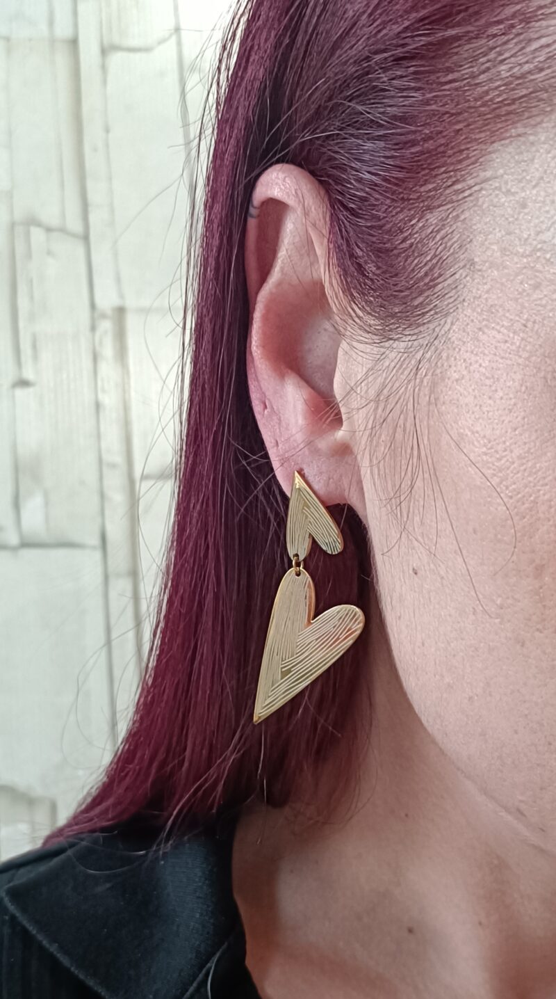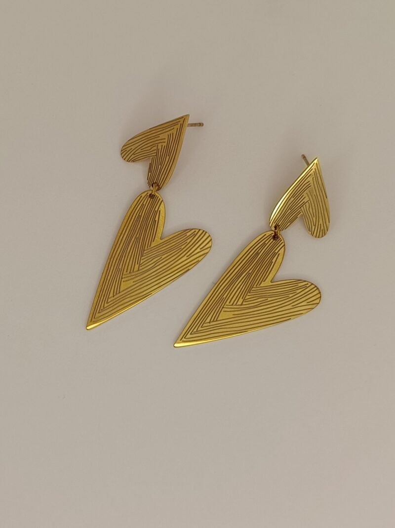 Los pendientes Doble Corazón destacan por su diseño moderno y estilizado, formado por dos corazones alargados unidos entre sí que crean una silueta elegante y muy favorecedora. Su acabado dorado con líneas grabadas aporta textura y movimiento, haciendo que brillen con cada gesto. Son ligeros, cómodos y perfectos para dar un toque romántico y sofisticado a cualquier look, ya sea para el día a día o para una ocasión especial.