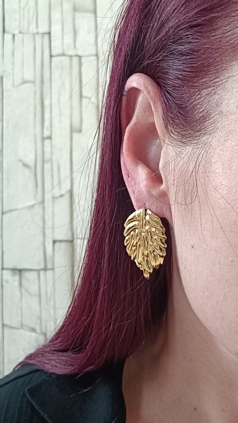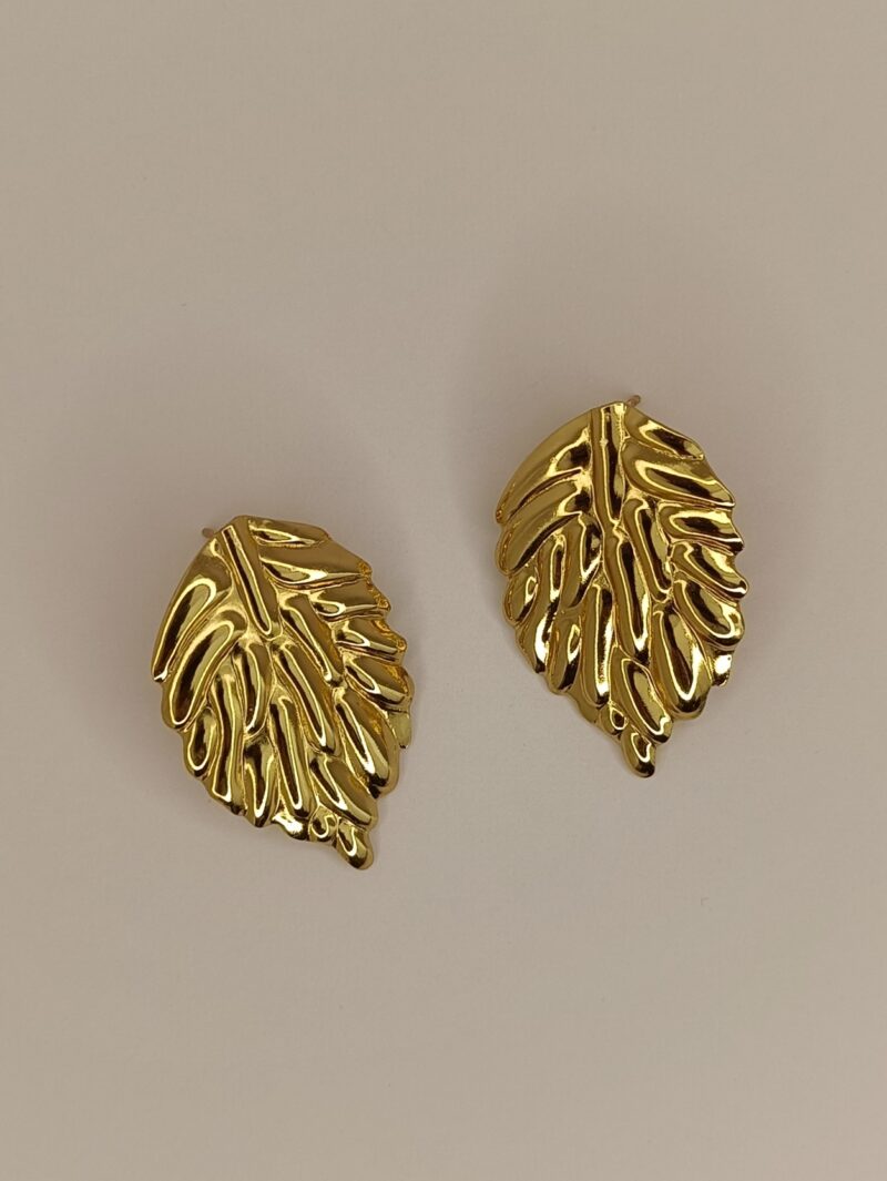Los pendientes Nature de acero inoxidable dorado con un diseño inspirado en hojas naturales. Su acabado pulido y los relieves en volumen aportan brillo, textura y un toque elegante que realza cualquier look. Ligeros y sofisticados, son perfectos para dar un aire fresco y distinguido tanto en el día a día como en ocasiones especiales.