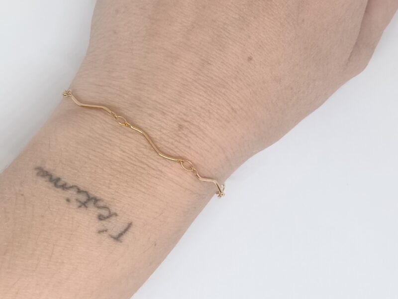 Una pulsera minimalista y moderna, con un diseño ondulado que simula una suave ola dorada. Es ligera, elegante y perfecta para quienes adoran los accesorios sutiles con un toque diferente. Su forma fluida aporta movimiento y delicadeza a la muñeca. Fabricada en acero inoxidable, es resistente, hipoalergénica y mantiene su brillo con el paso del tiempo.