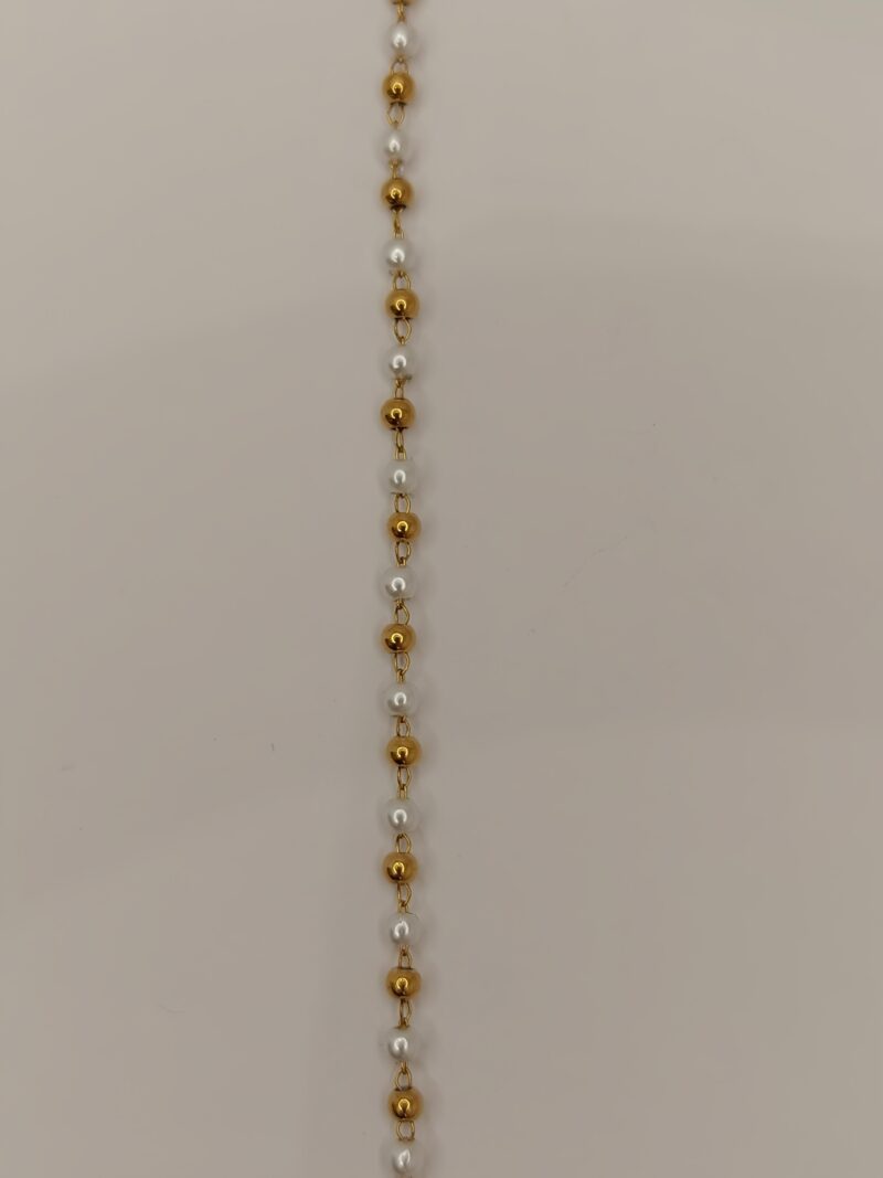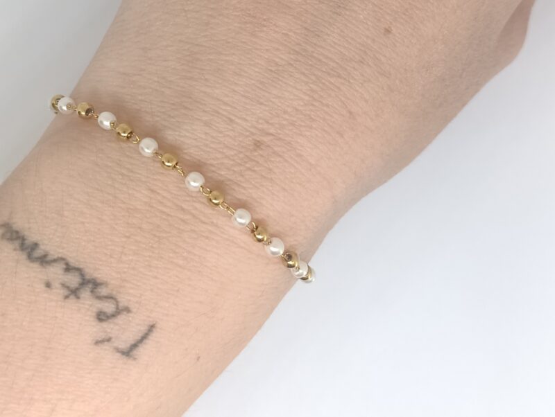 Una pulsera delicada y llena de encanto, combinando pequeñas perlas con esferas doradas que crean un contraste suave y luminoso. Perfecta para aportar un toque romántico y femenino a cualquier look. Su diseño ligero la hace ideal para el día a día o para llevar en ocasiones especiales. Fabricada en acero inoxidable, resistente y hipoalergénica.
